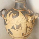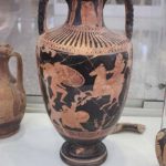 Local amphoras depict scenes from the Trojan war, where Amazonian queen Penthesilea on a horse opposite shielded Achilles on his feet, and another Amazonian warrior seated nearby are refigured. This scene representation allows us to see the painter’s perspective. Complementary motifs of the Attican style of 5th century BC are leaves, mints or crosses.